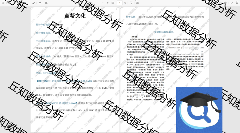 丘知数据分析会员之家,致力于提供高质量的社科数据搜集整理与分析服务,是国内领先的社科类数据服务商。在科研数据领域,我们认真对待每一位同学和老师的反馈,每年整理更新数千个变量指标,已累计服务数万科研工作者,在满足广大会员科研数据需求的同时全力提升售后服务质量,力求为大家提供高质量的社科数据服务! 在研究专题方面,我们搜集整理制作的数据专题包括但不限于:上市公司:管理层及治理、研发创新、投资融资、供应链、信息披露、会计审计税收、数字化、智能化、新质生产力、绿色发展、文本分析专题等;区域研究:空间计量、市场经济、科技创新、绿色发展、数字化、智能化、新质生产力、文本分析专题等。 丘知数据分析会员之家,每年更新推送近千个数据栏目,所有数据均支持单独购买,开通会员则可享受每日免费下载次数,欢迎老师同学们浏览订阅!如果您有定制需求也可以联系我们。