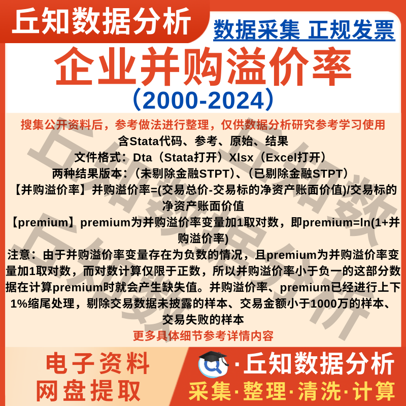 【普通数据】企业并购溢价率2024-2000年上市公司数据Stata代码剔除缩尾Excel