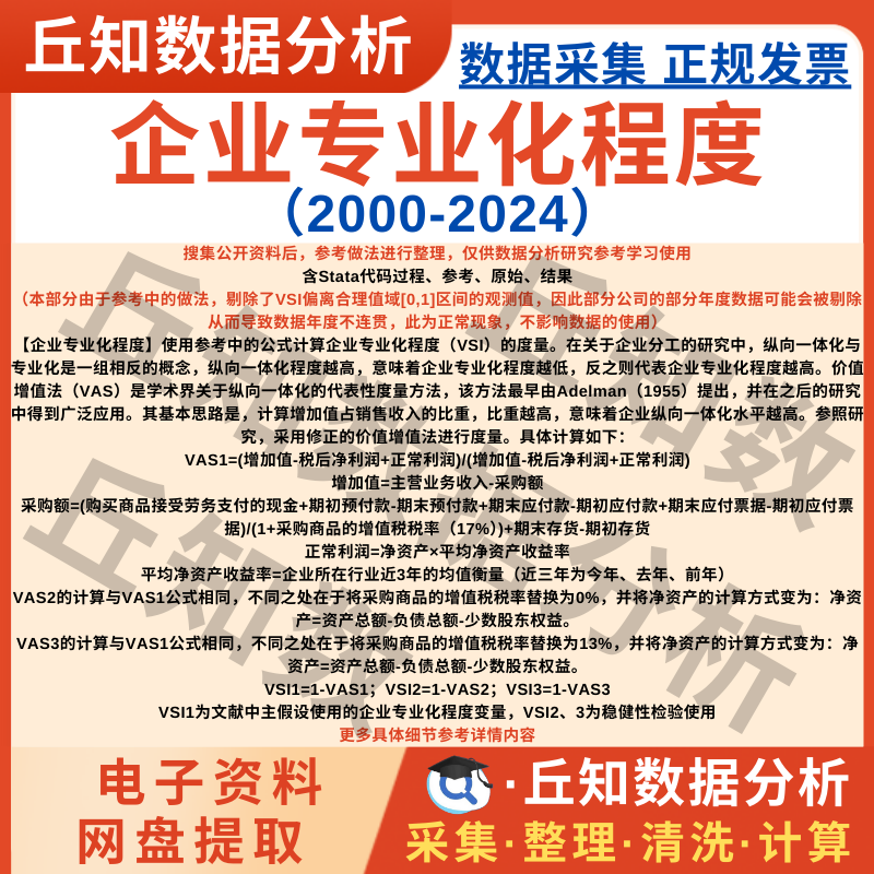 【普通数据】企业专业化程度2024-2000Stata代码纵向一体化上市公司数据Excel