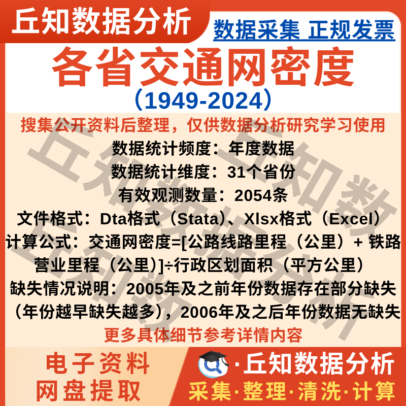 【普通数据】各省交通网密度数据2024-1949年铁路公路里程面积Excel表格Stata