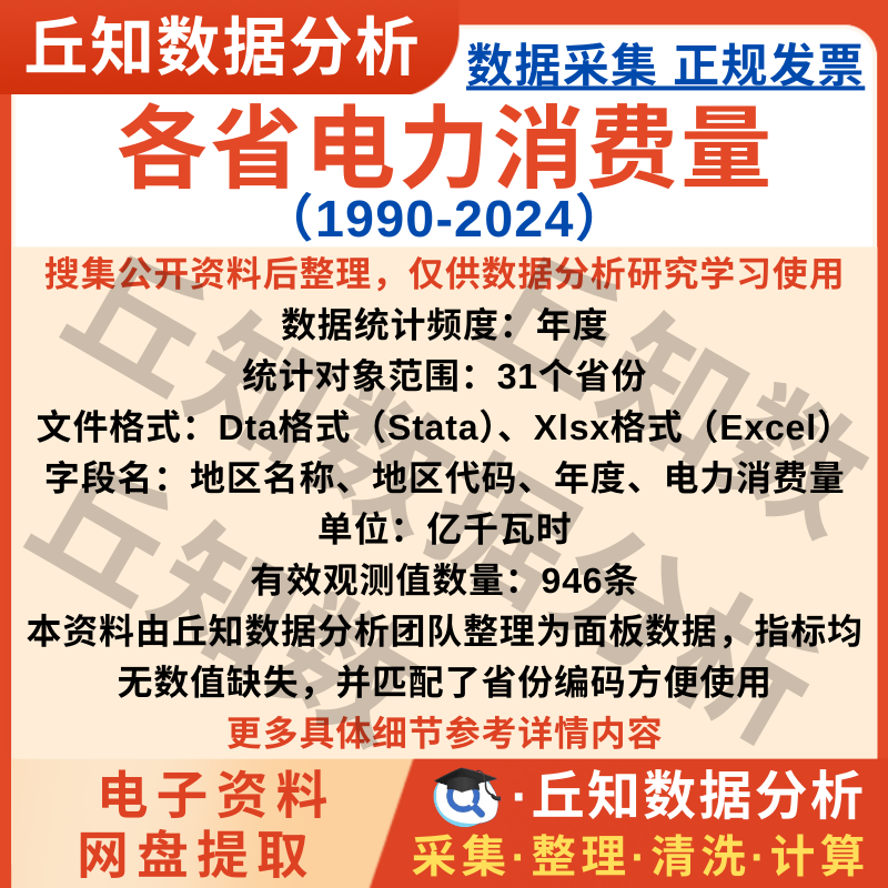 【普通数据】各省电力消费量数据2024-1990年含Stata与Excel汇总统计表无缺失