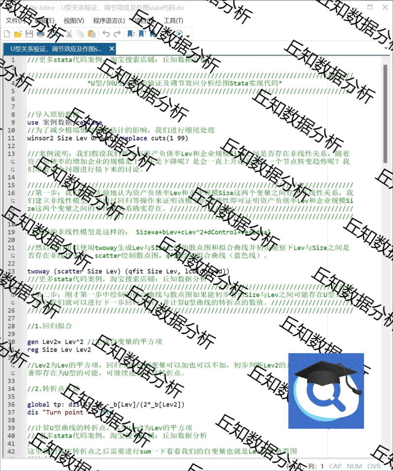 【高级数据】U型关系检验/调节效应绘图Stata代码+案例 Utest检验非线性关系