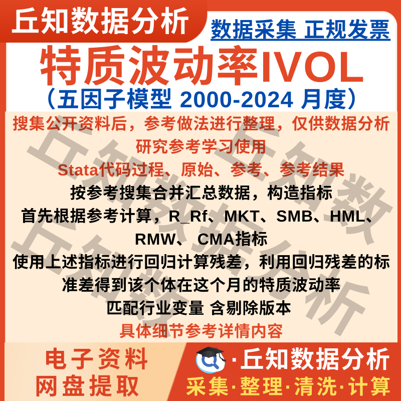 【普通数据】月度特质波动率IVOL五因子模型2024-2000年数据Stata代码上市公司