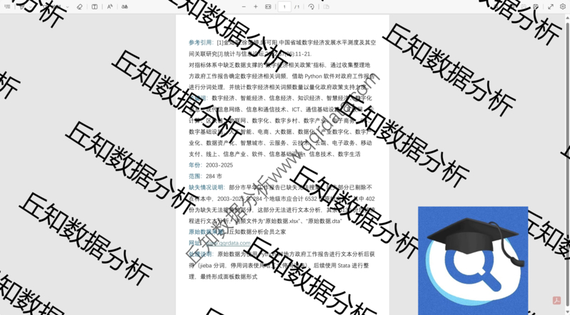 丘知数据分析会员之家,致力于提供高质量的社科数据搜集整理与分析服务,是国内领先的社科类数据服务商。在科研数据领域,我们认真对待每一位同学和老师的反馈,每年整理更新数千个变量指标,已累计服务数万科研工作者,在满足广大会员科研数据需求的同时全力提升售后服务质量,力求为大家提供高质量的社科数据服务! 在研究专题方面,我们搜集整理制作的数据专题包括但不限于:上市公司:管理层及治理、研发创新、投资融资、供应链、信息披露、会计审计税收、数字化、智能化、新质生产力、绿色发展、文本分析专题等;区域研究:空间计量、市场经济、科技创新、绿色发展、数字化、智能化、新质生产力、文本分析专题等。 丘知数据分析会员之家,每年更新推送近千个数据栏目,所有数据均支持单独购买,开通会员则可享受每日免费下载次数,欢迎老师同学们浏览订阅!如果您有定制需求也可以联系我们。
