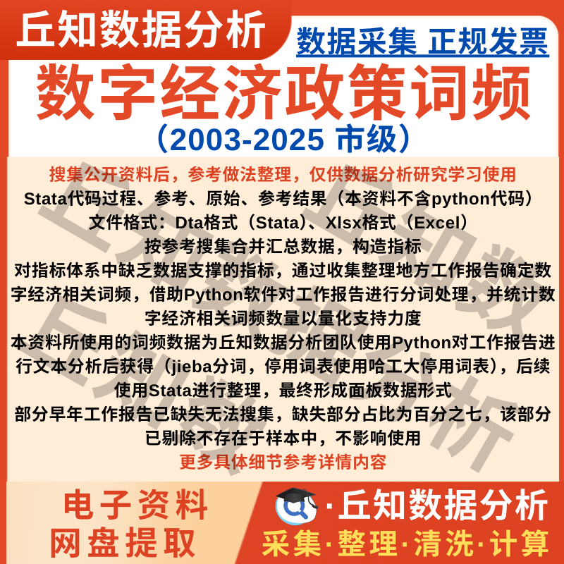 【普通数据】数字经济政策词频2025-2003市级文本分析数据Stata表格Xlsx说明